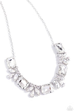 An oversized collection of white emerald cut gems and regally cut clusters of rhinestones delicately link below the collar, creating a dramatically sparkly fringe. Features an adjustable clasp closure.