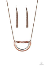 A strand of shiny copper beads give way to bowing silver and copper frames, creating an edgy pendant below the collar. Features an adjustable clasp closure. Sold as one individual necklace. Includes one pair of matching earrings.