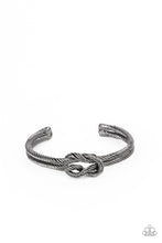 Gritty gunmetal cable-like bars curl around the wrist, knotting into an edgy cuff for a bold industrial look.