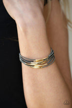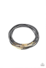 Featuring gold frames, spring-like gunmetal bracelets slide up and down the wrist for an edgy industrial look.