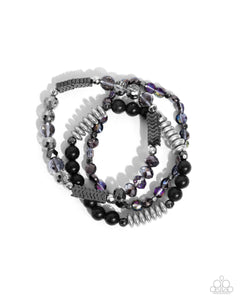 Infused along elastic stretchy bands, a collection of smoky, black, gunmetal, and gray beads in varying opacities and shapes shimmer and stack beside gunmetal wavy beads and oil spill beads for an attention-grabbing arrangement.