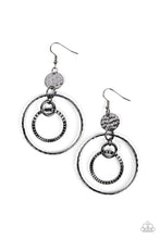 A mismatched pair of hammered and textured gunmetal hoops link at the bottom of a hammered gunmetal disc, creating an edgy lure. Earring attaches to a standard fishhook fitting.