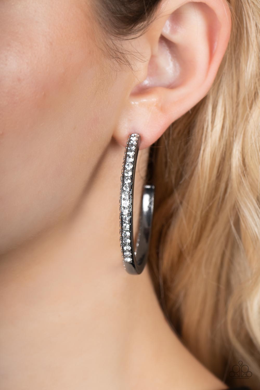 The front and outer edge of a timeless gunmetal hoop is unexpectedly encrusted in glassy white rhinestones, adding a timeless twist to the powerhouse piece. Hoop measures approximately 2" in diameter. Earring attaches to a standard post fitting.