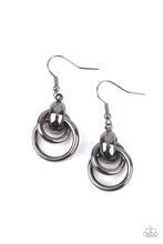 Featuring a high sheen, two different sized gunmetal rings are held by a bold clasp for a simple yet daring design. Earring attaches to a standard fishhook fitting.