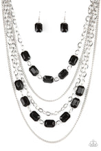 A stunning collection of silver chains and shiny rectangular black beads, falls in layers across the chest for a glamorous standout statement. Features an adjustable clasp closure.
