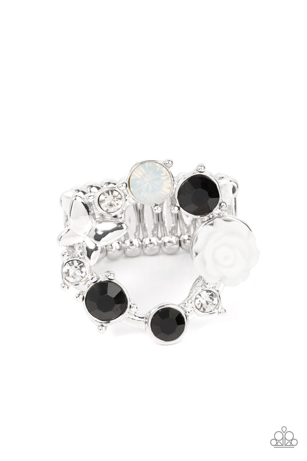 A glitzy collection of black, opal, and white rhinestones coalesce into a sparkly wreath atop the finger. Elegantly enhanced with a white resin rosebud, a dainty silver butterfly flutters atop the glittery centerpiece for an enchanting finish. Features a stretchy band for a flexible fit.