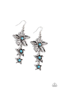 Vibrant turquoise stones, pressed in warped, three-dimensional silver flowers, gradually decrease in size as they link down the ear to create a whimsical lure. Dainty silver studs coalesce the centers of each flower, adding tactile detail to the floral design. Earring attaches to a standard fishhook fitting. As the stone elements in this piece are natural, some color variation is normal.