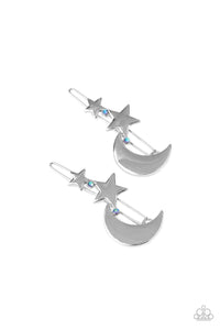 Infused with dainty iridescent rhinestones, a pair of shiny silver stars and a silver half moon join into a stellar frame. Features clamp barrette closures.