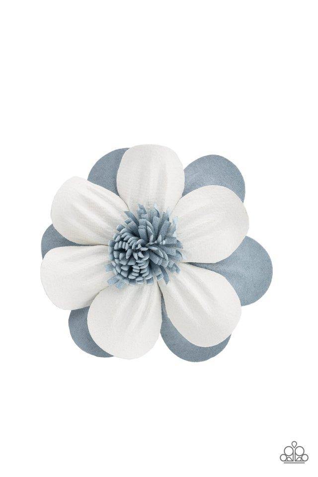 Paper-like blue and white petals bloom from a lifelike blue center, creating a summery blossom. Features a standard hair clip on the back.