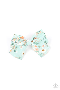Printed in a vintage inspired floral pattern, a ribbon of blue crepe-like fabric delicately knots into a colorful bow for a country inspired finish. Features a standard hair clip on the back.