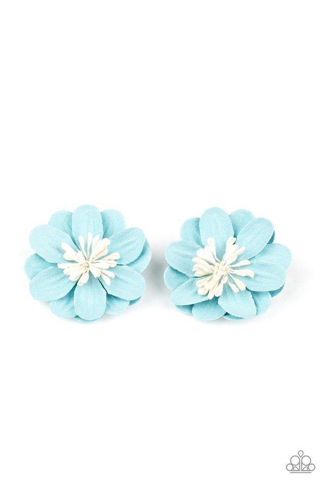 Blue paper-like petals delicately gather around life-like white beaded centers, creating a colorfully whimsical pair of blossoms. Each flower features a standard hair clip on the back.