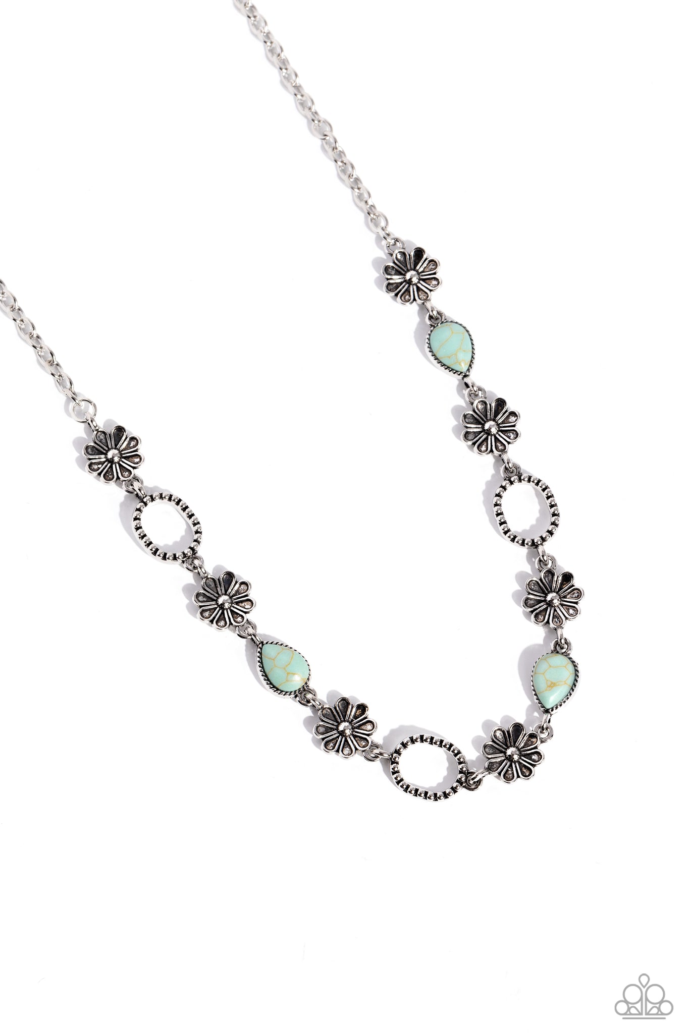 Metallic daisy charms, silver hoops studded with a dot motif, and light blue teardrop stones, pressed into textured silver frames interlock together around the neck for a free-spirited flair. Features an adjustable clasp closure. As the stone elements in this piece are natural, some color variation is normal.
