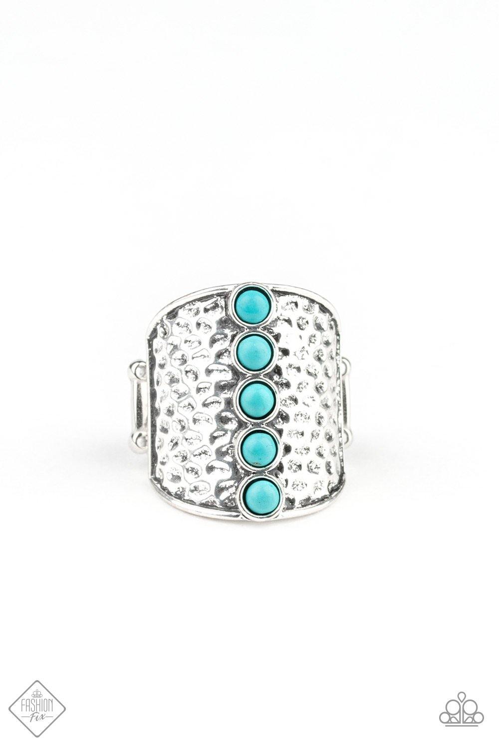 A row of dainty turquoise stones are stacked vertically down the center of a hammered silver frame for a seasonal flair. Features a stretchy band for a flexible fit.