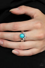 Daintily crowned in a curved row of opaque white rhinestones, a round turquoise stone is pressed into the center of a dainty silver band, resulting in an enchantingly earthy centerpiece atop the finger. Features a dainty stretchy band for a flexible fit.