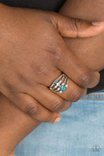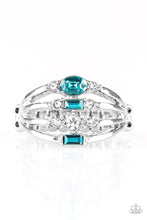 Featuring round, oval, and emerald style cuts, dainty blue and white rhinestones are sprinkled along dainty silver bands, coalescing into a refined frame. Features a dainty stretchy band for a flexible fit.