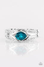 Encrusted in glassy white rhinestones, silver ribbons arc across the finger, coalescing into a glittery band. An oval blue rhinestone sits atop the sparkling band, creating a glamourous centerpiece. Features a dainty stretchy band for a flexible fit.