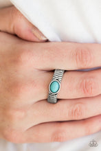 A refreshing blue bead is pressed into a dainty silver band radiating with striped texture for a seasonal look. Features a dainty stretchy band for a flexible fit.