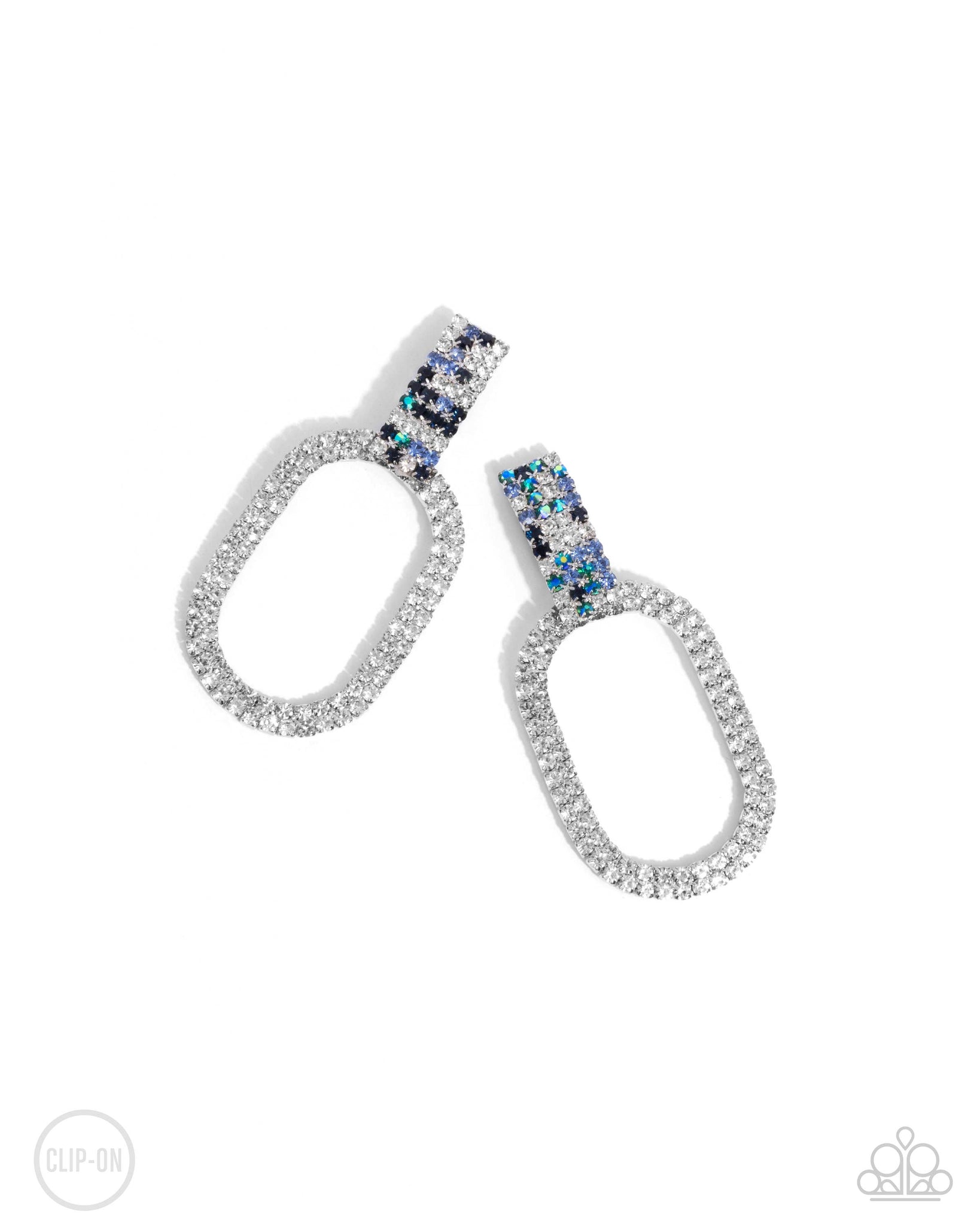 A doubled row of glistening white rhinestones cascades from row after row of stacked white, Montana, light sapphire, and iridescent sapphire rhinestones from an elegant rectangular post for an oversized opulent display. Earring attaches to a standard clip-on fitting.