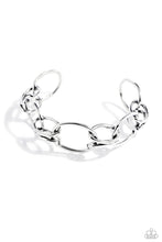 Oval silver links interlock with pairs of connected silver links, resulting in an edgy cuff around the wrist.