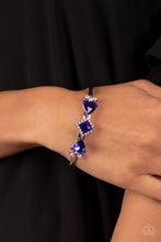 Bordered in glassy white rhinestones, a square cut blue rhinestone is flanked by a pair of triangular blue gems across the front of a dainty silver cuff. Clusters of dainty white rhinestones adorn the sides of the centerpiece for a glitzy and glamorous finish.