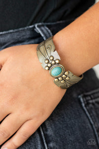 An oval turquoise stone is pressed into the center of a decorative brass feather cuff that is embellished in studded and frilly brass details for a rustic flair.