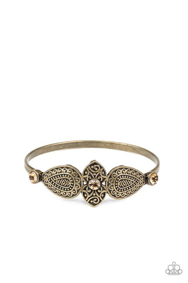 Embossed in decorative filigree, leafy brass frames connect into a whimsical centerpiece atop a brass bangle. Glittery topaz rhinestones dot the ornate centerpiece, adding colorful sparkle to the dainty piece.