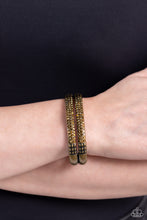 Three rows of dainty aurum rhinestones are encrusted along two thick brass layers as they stack upon the wrist. Rows of studded brass in a dot-motif border the glittery design for additional texture on the industrial showstopper. Features a hinged closure.