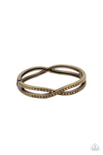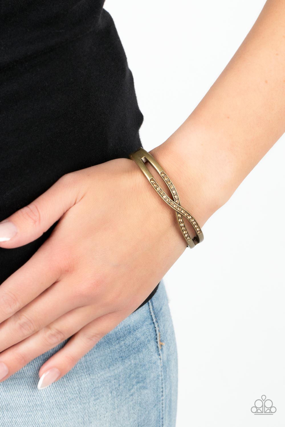 Dotted in dainty topaz rhinestones, antiqued brass ribbons delicately weave into a bangle-like cuff around the wrist for a rustic finish. Features a hinged closure.