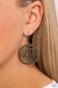 Whirling brass bars unfurl into a mandala-like pattern inside of a dainty brass hoop, creating a whimsical showcase of rustic texture. Earring attaches to a standard fishhook fitting.