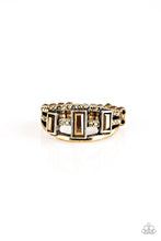 Three aurum emerald-cut rhinestones are encrusted along three brass bands radiating with smooth surfaces and sections of glittery aurum rhinestones for an edgy fashion. Features a stretchy band for a flexible fit.