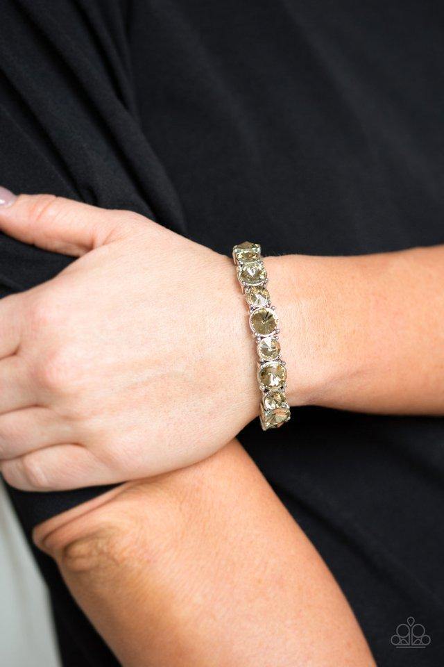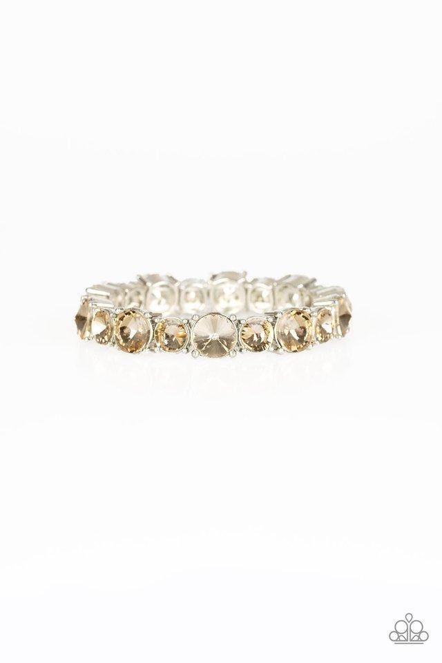 An assortment of oversized golden topaz rhinestones are pressed into sleek square frames and threaded along stretchy bands, creating a blinding sparkle around the wrist.