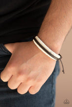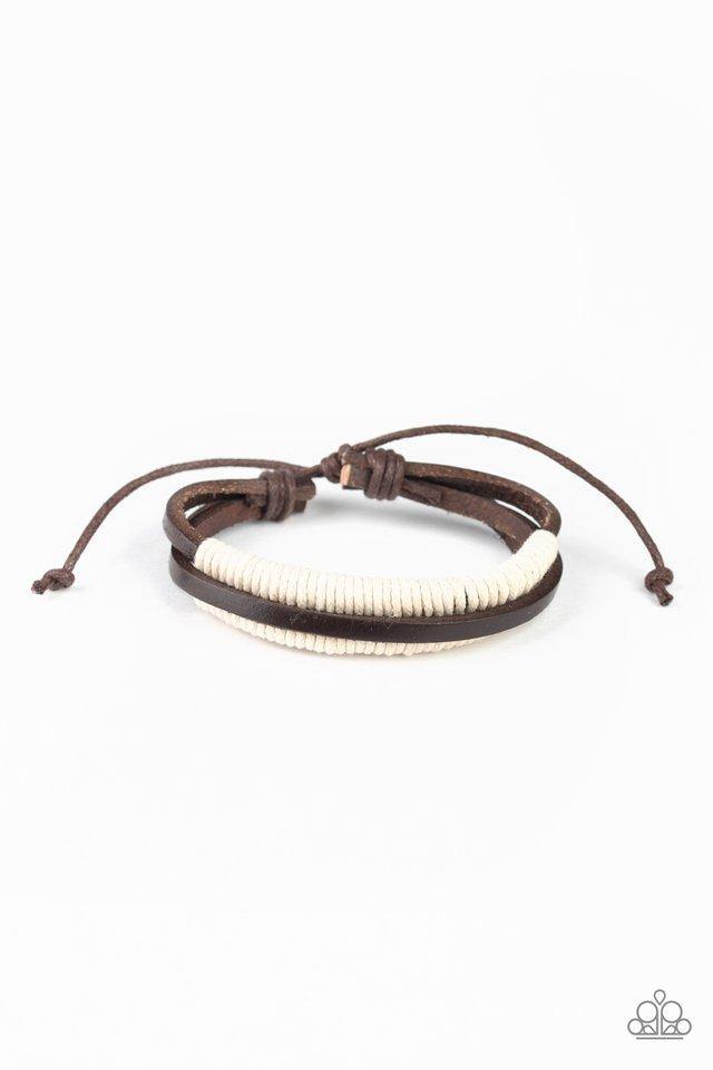 Infused with a plain leather band, white twine knots around two leather bands, creating earthy layers across the wrist. Features an adjustable sliding knot closure.