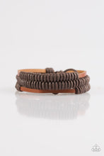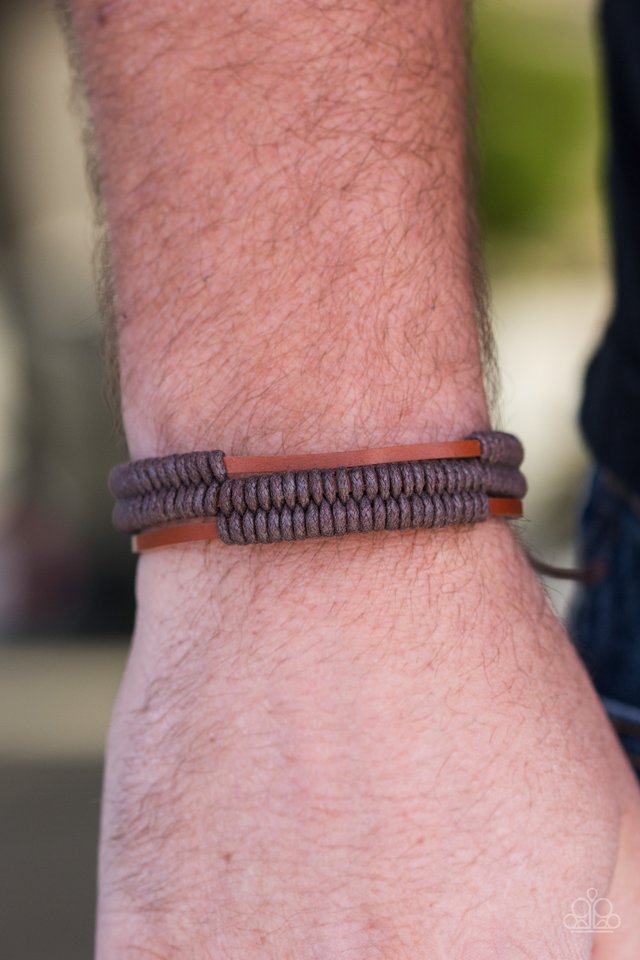 Shiny brown cords knot around three brown leather strands, securing the bands in place across the wrist for a rugged look. Features an adjustable sliding knot closure.