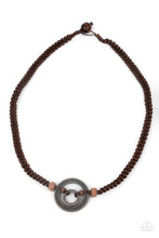 Infused with dainty wooden beads, two tin-finished silver rings are knotted in place along a braided strand of brown cording below the collar for an earthy flair. Features a button loop closure.