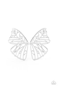 Shimmery silver bars delicately climb scalloped silver frames, coalescing into a whimsical butterfly wing. Earring attaches to a standard post fitting.