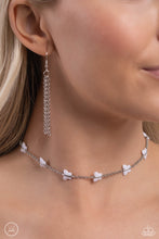 Infused along a row of dainty silver chain, a collection of white butterflies coalesces around the neckline for a whimsical finish. Features an adjustable clasp closure.