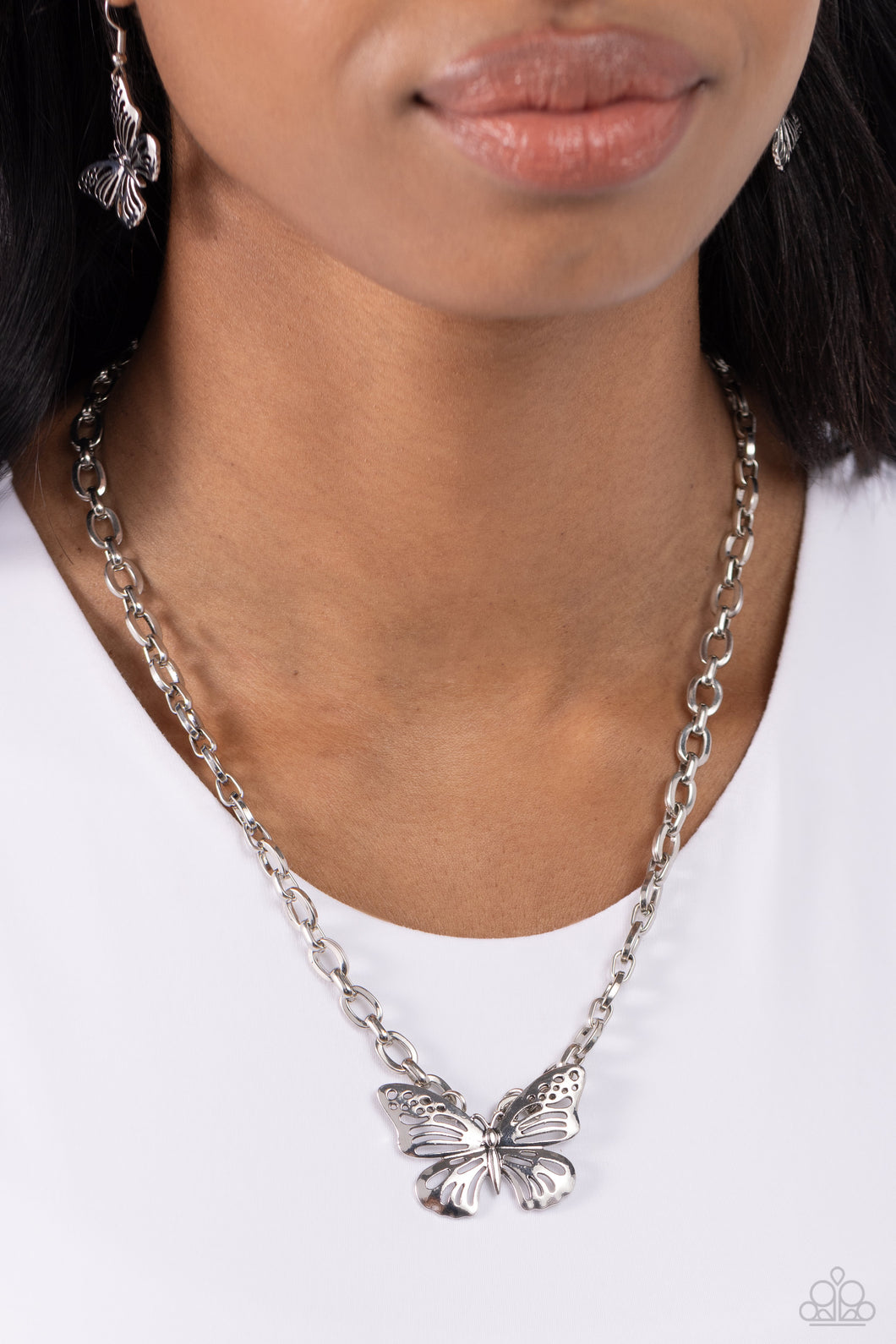 Featuring airy cutout details, a high-sheen silver butterfly is connected to the bottom of a thick silver link chain for a whimsically monochromatic statement. Features an adjustable clasp closure.