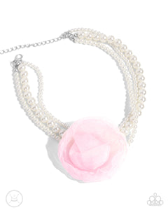 A trio of glossy white pearly strands in varying sizes coalesce around the collar for a radiant, refined look. An oversized baby pink tulle rosette adorns the center of the pearly strands for a feminine finish. Features an adjustable clasp closure.