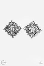 Gradually increasing in size, glittery hematite rhinestones are encrusted along three stacking gunmetal frames for a regal look. The square frames slightly curve in towards the ear for an edgy finish. Earring attaches to a standard clip-on fitting.