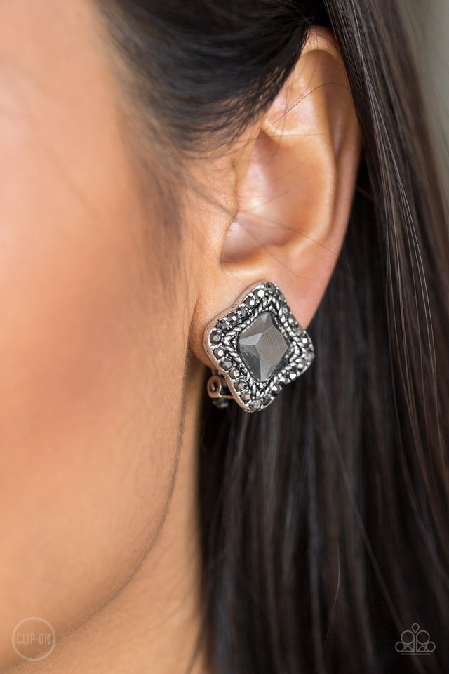 Encrusted in dazzling hematite rhinestones, an asymmetrical square frame encases a glittery hematite gem for a regal look. Earring attaches to a standard clip-on fitting.