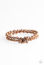 Metallic coppery crystal-like beads and faceted copper beads are threaded along stretchy elastic bands. Matching copper beads swing from the wrist, creating clustered centerpieces.