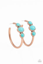 The front of a rustic copper hoop is encrusted in a mismatched collection of teardrop, oval, and round turquoise stones, invoking an earthy twist. Earring attaches to a standard post fitting. Hoop measures approximately 1 1/2" in diameter.