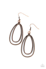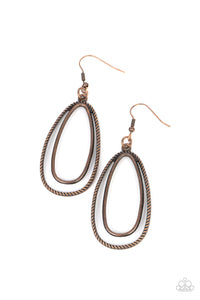 Layered one inside the other, a smooth oval hoop brushed in antiqued copper texture is paired with a rustic frame wrapped in rope-like texture creating an airy, yet rustic design. Earring attaches to a standard fishhook fitting.