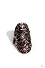 Embossed in a studded paisley pattern, a thick copper frame folds around the finger for a whimsically vintage look. Features a stretchy band for a flexible fit.