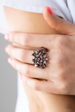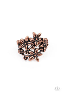 A lovely collection of antiqued copper blossoms coalesce into an airy frame for a whimsical finish across the finger. Features a stretchy band for a flexible fit.