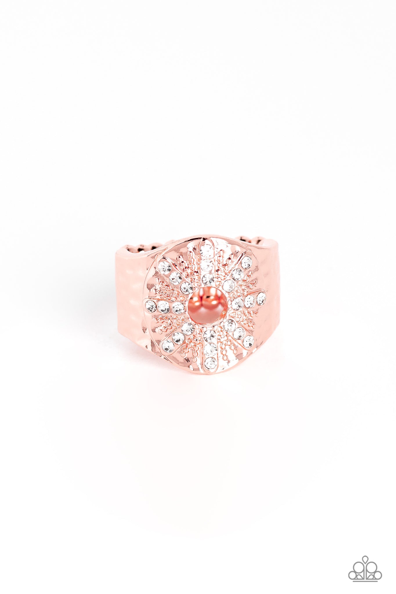 Dainty white rhinestones alternate with textured shiny copper studs around an airy center, creating a radiant sunburst pattern that fans out atop a hammered shiny copper band for an optimistic finish. Features a stretchy band for a flexible fit.