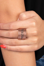 Across a wide copper band with a hammered sheen, the phrase Rise & Shine" is stamped in varying fonts for a merry message. Features a stretchy band for a flexible fit.