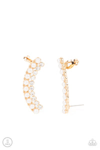 Featuring classic gold fittings, two rows of dainty white pearls and glassy white rhinestones arch into a timeless statement piece. Earring attaches to a standard post earring. Features a clip-on fitting at the top for a secure fit.