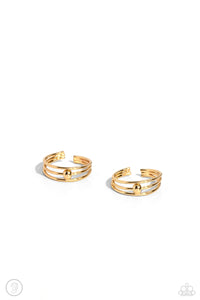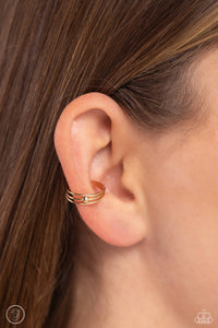 A trio of thin, sleek gold bars arc around the ear to create a trendy, adjustable, one-size-fits-all cuff. A solitaire gold stud dots the center of the layered display for additional eye-catching detail.