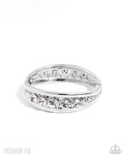 The front-facing surface of a thick silver cuff is dipped in white rhinestones that gradually increase in size towards the center of the tapered ends of the cuff for a blinding finish. Features a hinged closure.